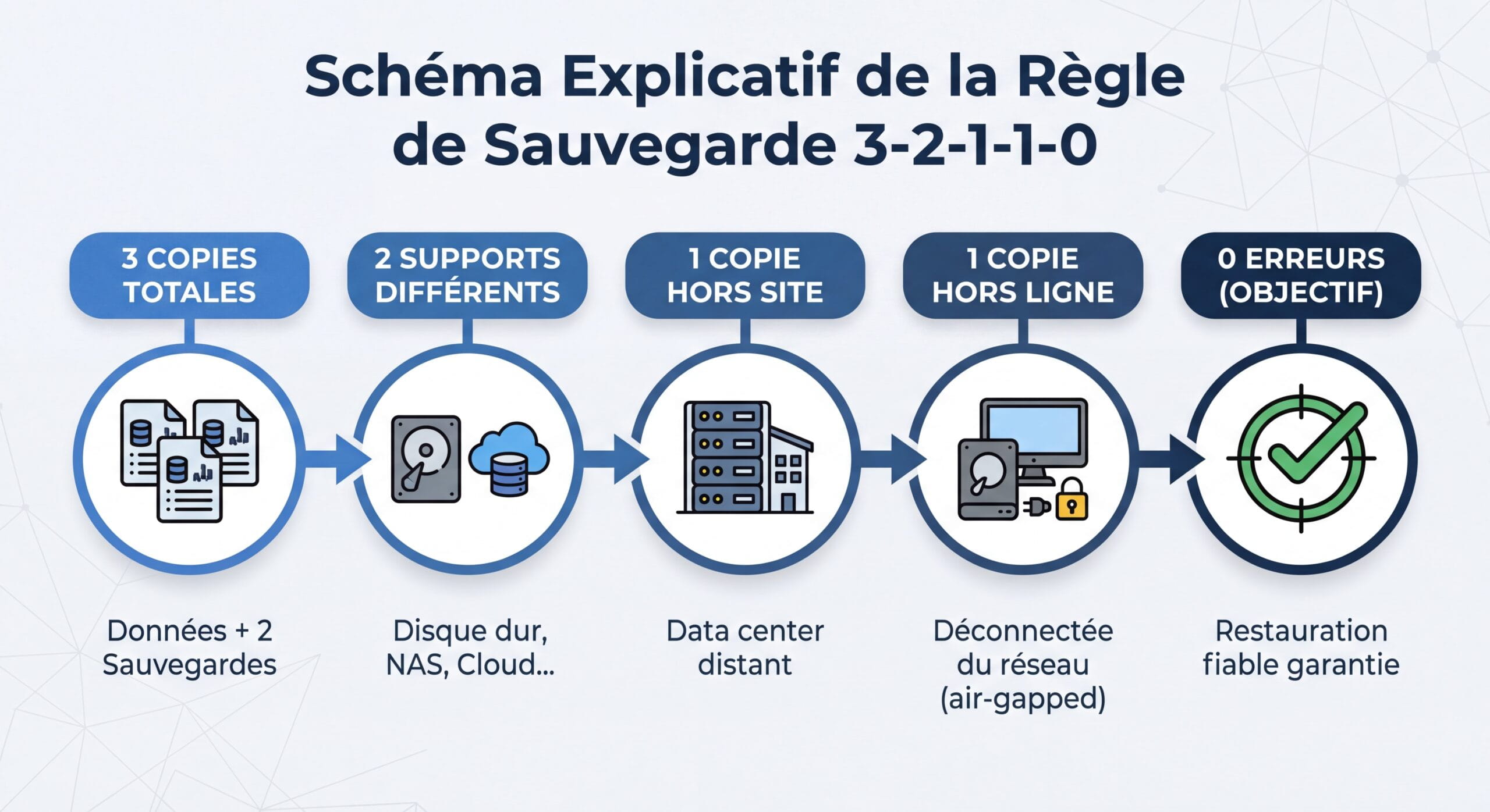 La règle 3-2-1 est la recommandation de référence de l’ANSSI pour sécuriser vos données. Elle consiste à conserver 3 copies de vos données, sur 2 supports différents, dont 1 copie stockée hors site (dans un datacenter distant ou dans le cloud). Dans sa version évoluée 3-2-1-1-0, elle ajoute une copie hors ligne (non connectée au réseau) et impose zéro erreur de restauration grâce à des tests réguliers.