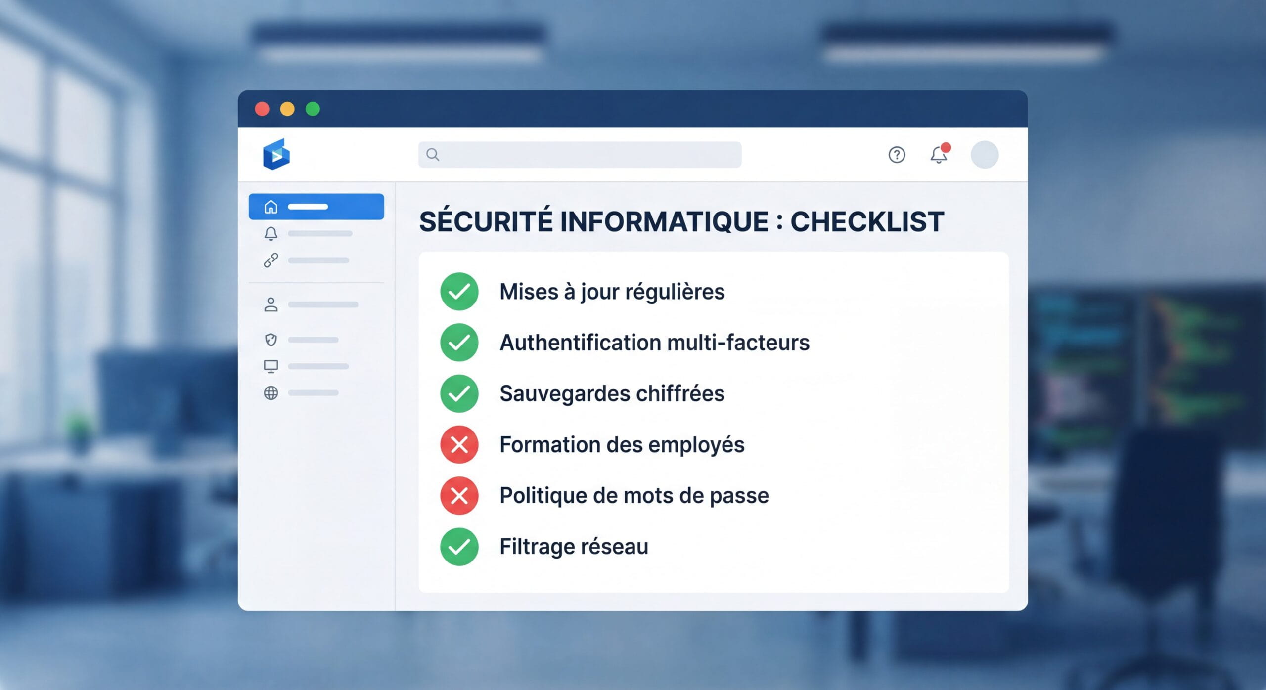 Configurez les mises à jour automatiques pour Windows, les applications et l’antivirus. Planifiez une maintenance mensuelle pour vérifier que tous les systèmes sont à jour, y compris les serveurs et les équipements réseau.