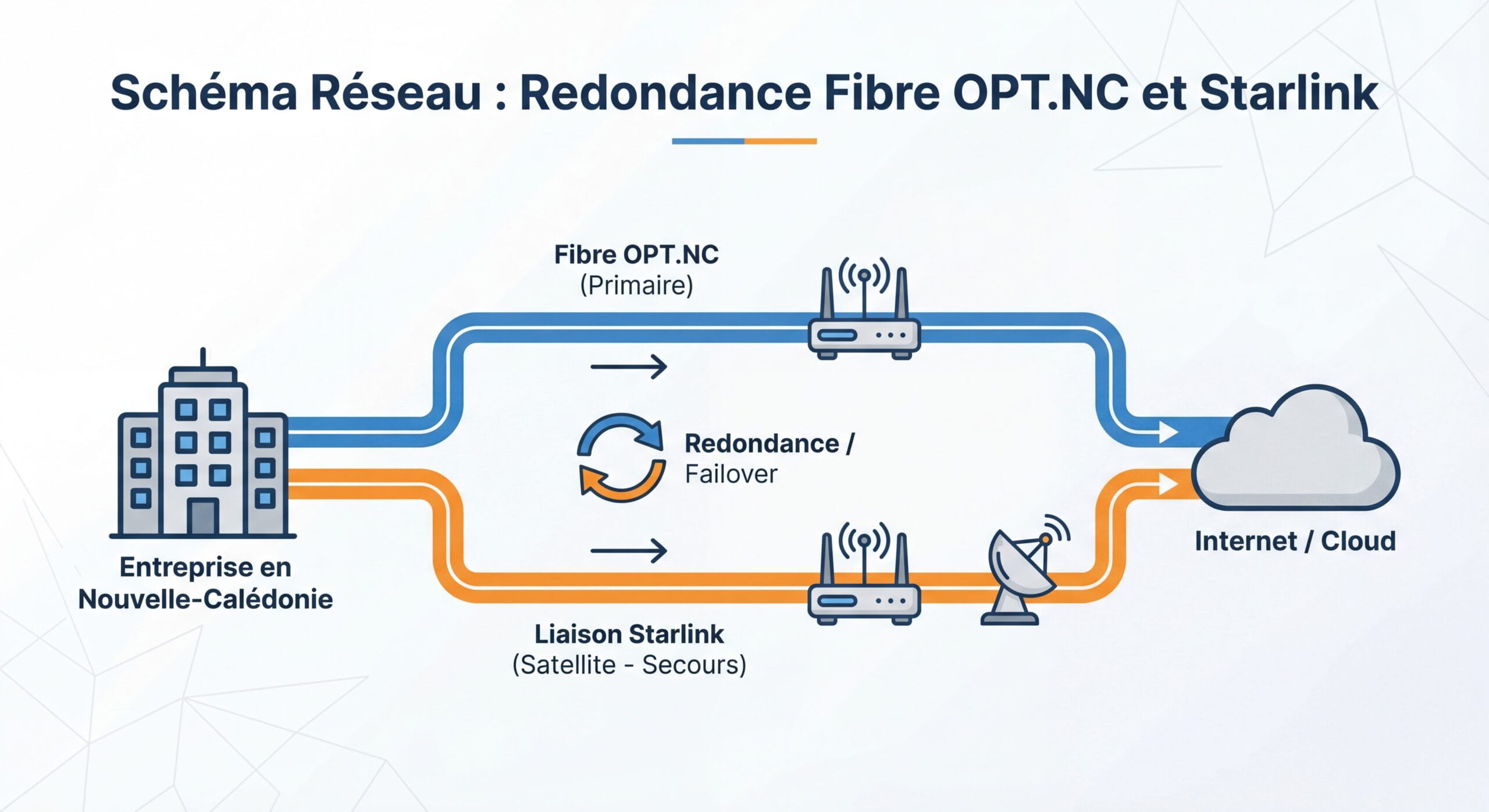 La redondance de lien consiste à avoir deux connexions internet indépendantes qui fonctionnent en parallèle. Si votre connexion principale (fibre OPT.NC) tombe, votre réseau bascule automatiquement sur le lien secondaire (Starlink) sans interruption perceptible. En Nouvelle-Calédonie, où les coupures de fibre liées aux travaux de BTP sont récurrentes, cette solution est devenue indispensable pour toute entreprise ou collectivité dépendante du numérique.